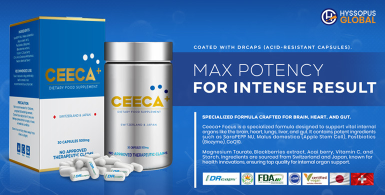 Ceeca+ Focus is a specialized formula designed to support vital internal organs like the brain, heart, lungs, liver, and gut. It contains potent ingredients such as SaraPEPP NU, Malus domestica (Apple Stem Cell), Postbiotics (Biozyme), CoQ10. Magnesium Taurate, Blackberries extract, Acai berry, Vitamin C, and Starch. Ingredients are sourced from Switzerland and Japan, known for health innovations, ensuring top quality for internal organ support.